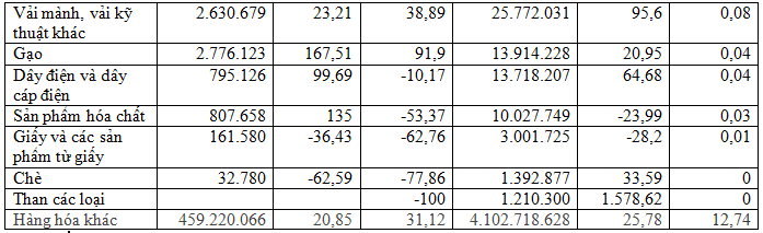 Nhóm hàng Máy vi tính, sản phẩm điện tử và linh kiện đứng thứ 2 về kim ngạch với gần 4,81 tỷ USD, chiếm 14,9%, tăng 3,2%; tiếp đến nhóm hàng Máy móc, thiết bị, dụng cụ, phụ tùng chiếm 10,3%, đạt 3,3 tỷ USD, tăng mạnh 47,5%; Giày dép các loại chiếm 9,8%, đạt 3,15 tỷ USD, tăng 5%; Hàng dệt, may chiếm 7,9%, đạt 2,53 tỷ USD, tăng 0,7%.