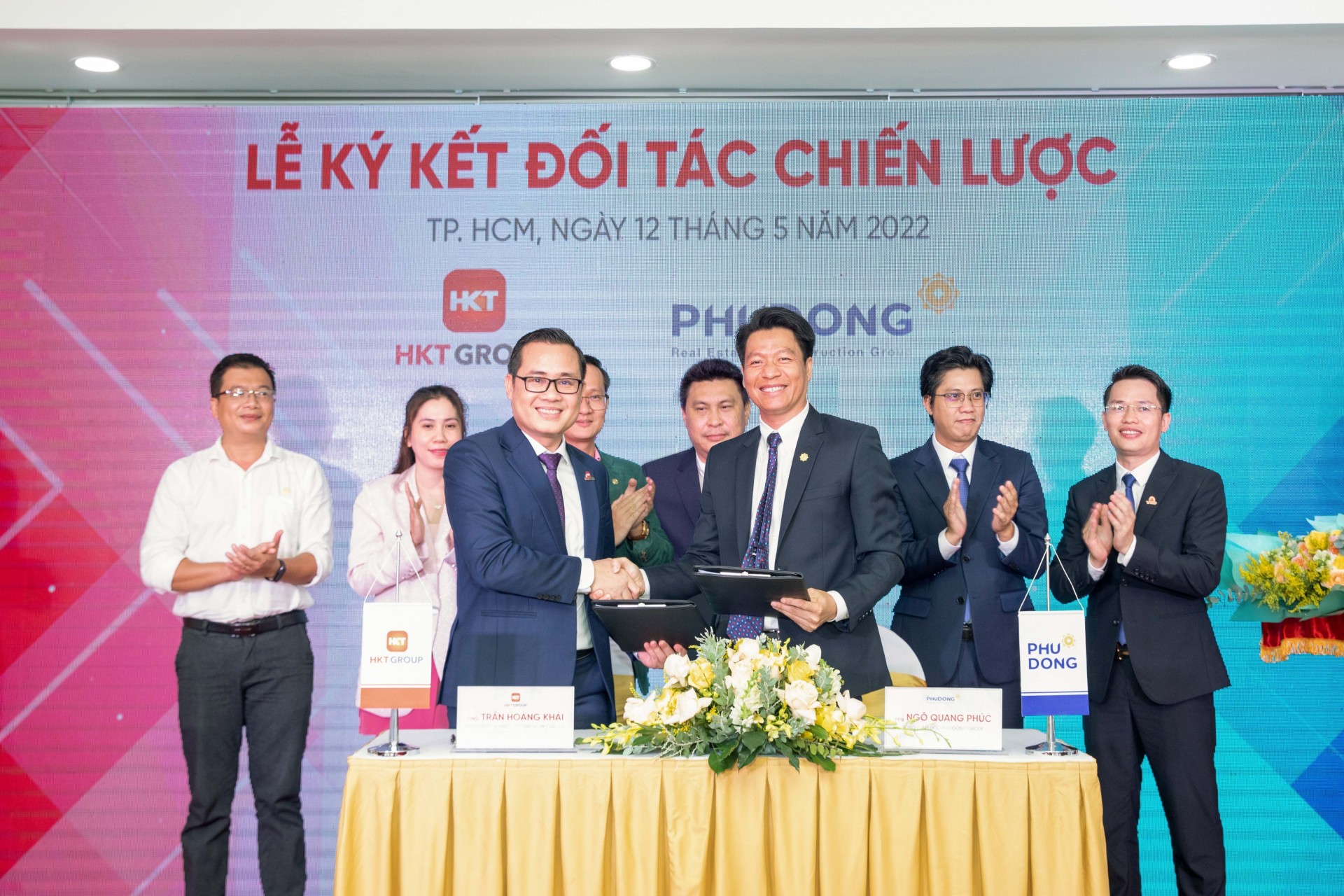Ông Trần Hoàng Khải - Tổng Giám đốc HKT GROUP và ông Ngô Quang Phúc - Tổng Giám đốc Phú Đông Group thực hiện nghi thức ký kết |