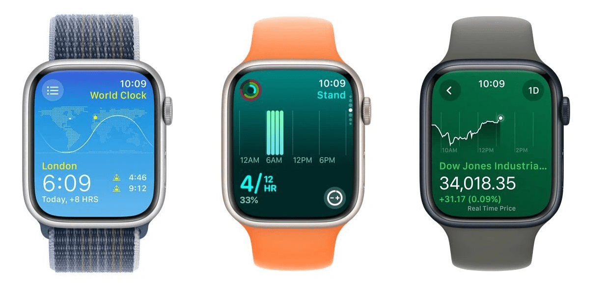 Màn hình Apple Watch ngày càng lớn hơn và Apple đang tận dụng lợi thế đó để giới thiệu một ngôn ngữ thiết kế mới trong watchOS 10. Các ứng dụng gốc của Apple bao gồm: Weather, Stocks, Home, Maps, Messages, World Clock và các ứng dụng khác sử dụng nhiều màn hình hơn để cung cấp thêm thông tin.