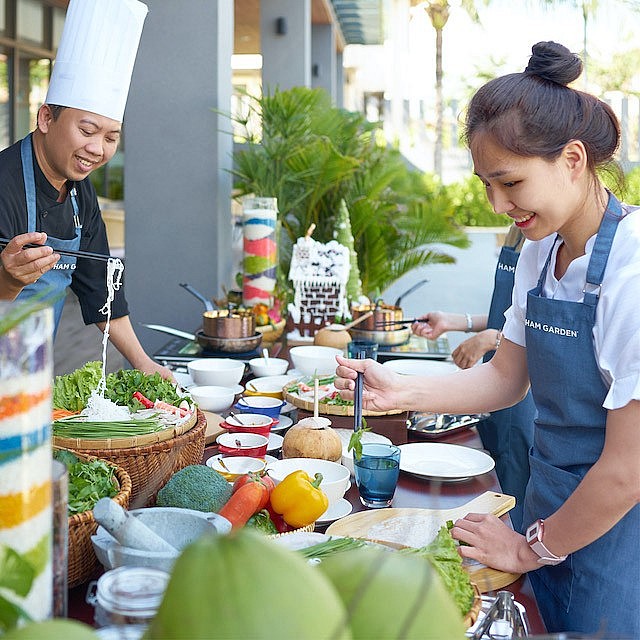 Hành trình trải nghiệm ẩm thực tại Wyndham Garden Cam Ranh sẽ thêm phần thú vị khi thực khách có thể tự tay thực hiện những món ăn đầy hấp dẫn: gỏi bưởi, bò lúc lắc, bánh xèo, phở… dưới sự hướng dẫn của đầu bếp tài hoa.
