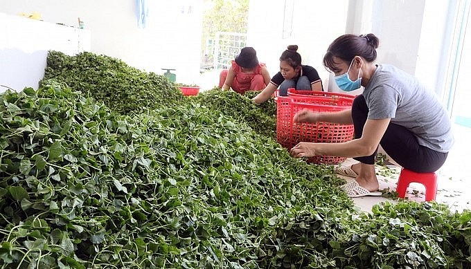 Sơ chế rau má trước khi đưa đi tiêu thụ tại HTX Quảng Thọ 2. |