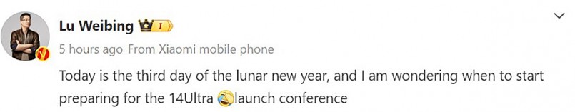 Một bài đăng mới trên Twitter của Lu Weibing, chủ tịch của Tập đoàn Xiaomi, tiết lộ ông đang cân nhắc về thời điểm bắt đầu chuẩn bị cho sự kiện ra mắt Xiaomi 14 Ultra. Điều này cho thấy sẽ có một sự kiện ra mắt dành riêng cho Xiaomi 14 Ultra dành cho thị trường Trung Quốc.