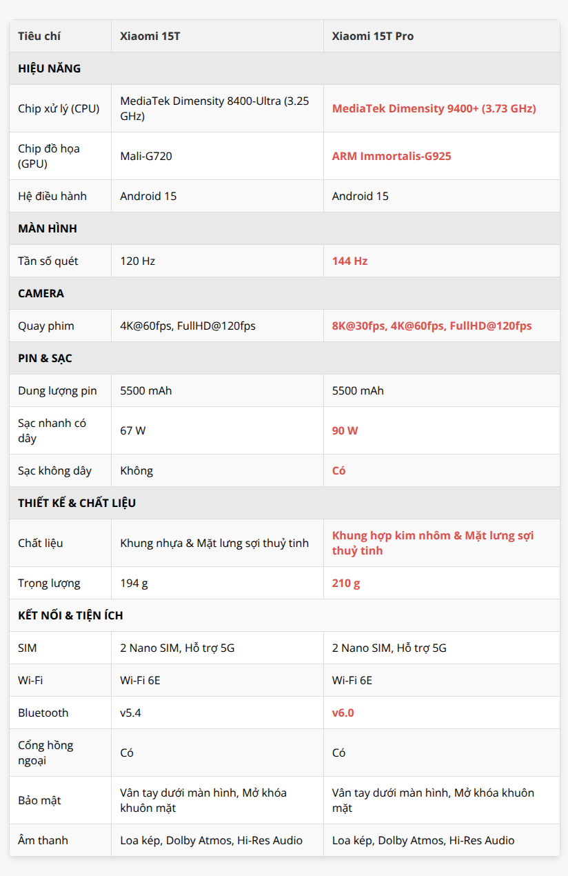 Xiaomi 15T Series được trang bị những bộ vi xử lý mạnh mẽ nhất từ MediaTek. Phiên bản Pro sử dụng chip Dimensity 9400+ sản xuất trên tiến trình 3nm, trong khi bản tiêu chuẩn là Dimensity 8400-Ultra trên tiến trình 4nm. Cả hai đều được trang bị RAM LPDDR5X, bộ nhớ UFS 4.1 và hệ thống tản nhiệt Xiaomi 3D IceLoop, đảm bảo hiệu suất ổn định ngay cả khi xử lý các tác vụ nặng.