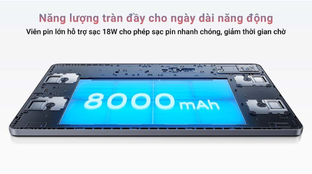 Dung lượng pin cực lớn lên đến 8000mAh trên Redmi Pad giúp bạn sử dụng máy suốt cả ngày, loại bỏ nỗi lo về nguồn điện trong lúc làm việc, học tập hay giải trí. Hỗ trợ sạc nhanh 18W cũng sẽ giúp nhanh chóng sạc đầy pin, giảm thời gian chờ đợi. Với viên pin này, Redmi Pad sẽ cung cấp lên đến 26 giờ đọc sách, 21 giờ xem video hoặc 12 giờ chơi game.