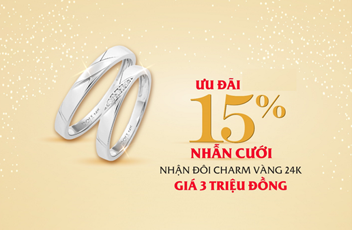 Mừng sinh nhật 29 năm "Vươn cao tỏa sáng", DOJI ưu đãi giới thiệu 600 cặp nhẫn cưới kim cương tự nhiên giá 6 triệu đồng nhằm tôn vinh vẻ đẹp lấp lánh của tình yêu đôi lứa (*). Đặc biệt, nhân dịp này, DOJI còn áp dụng ưu đãi nhân đôi hấp dẫn cho các sản phẩm nhẫn cưới, nhẫn đính hôn khác: - Ưu đãi 15% - Tặng thêm đôi charm Vàng 24K tinh xảo trị giá tới 3 triệu đồng với hóa đơn trị giá từ 40 triệu đồng. Chương trình áp dụng từ nay đến hết 31/07/2023 tại hệ thống Trung tâm VBTS DOJI toàn quốc. (*) Không áp dụng cùng chương trình ưu đãi 15%. Xem thêm thông tin tại: Hotline: 18001168 Website: https://bit.ly/3q26ZyA Facebook: https://www.facebook.com/doji.trangsuc |