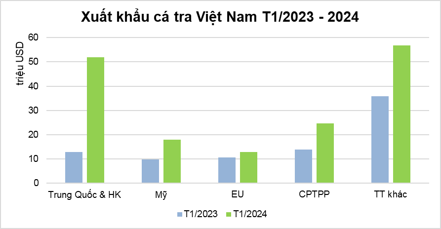 Theo Hiệp hội Chế biến và Xuất khẩu Thủy sản Việt Nam (VASEP), trong tháng 1, xuất khẩu cá tra đạt 165 triệu USD, tăng 97% so với cùng kỳ năm 2023. Trong đó, các thị trường chính tiêu thụ nhiều nhất cá tra đều ghi nhận tăng trưởng dương như: Mỹ, Trung Quốc và Hồng Kông, thị trường EU, các nước trong khối Đối tác Toàn diện và Tiến bộ xuyên Thái Bình Dương (CPTPP)... Sản phẩm cá tra chủ lực xuất khẩu trong tháng 1/2024 vẫn là phile đông lạnh với giá trị đạt hơn 131 triệu USD, tăng 87% so với cùng kỳ năm 2023, chiếm 80% tỷ trọng.