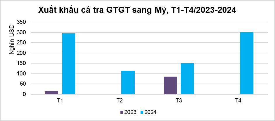 Tháng 4/2024, xuất khẩu các sản phẩm cá tra giá trị gia tăng sang Hoa Kỳ đạt hơn 300 nghìn USD so với chỉ 5 USD giá trị xuất khẩu các sản phẩm này trong tháng 4/2023 (tăng gấp 67 nghìn lần). Tính đến hết tháng 4/2024, Hoa Kỳ tăng gấp 8,5 lần nhập khẩu các sản phẩm giá trị gia tăng từ Việt Nam với 860 nghìn USD.
