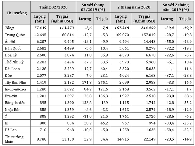 Trung Quốc vẫn là thị trường xuất khẩu cao su lớn nhất của Việt Nam, đạt gần 42.700 nghìn tấn, trị giá 60,81 triệu USD, giảm gần 36% về lượng và giảm 37% về trị giá so với tháng 1/2020; đồng thời giảm 12,7% về lượng và giảm 5,3% về trị giá so với tháng 2/2019.