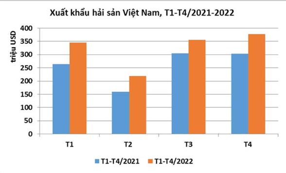 Theo Hiệp hội Chế biến và Xuất khẩu Thủy sản Việt Nam (VASEP), tháng 4/2022, tổng xuất khẩu các sản phẩm hải sản khai thác của Việt Nam đạt gần 377 triệu USD, tăng 24% so với cùng kỳ năm 2021.