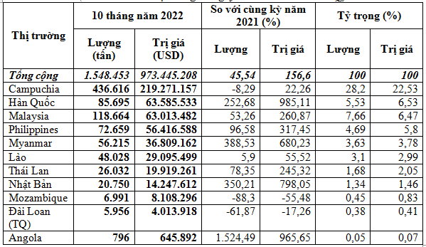Riêng tháng 10/2022 xuất khẩu sang thị trường này tăng 49,3% về khối lượng, nhưng giảm 0,3% về kim ngạch và giảm 33,3% về giá so với tháng 9/2022, đạt 60.160 tấn, tương đương 19,61 triệu USD.