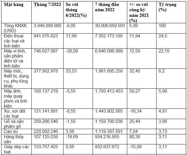 Trong 7 tháng đầu năm 2022, điện thoại các loại và linh kiện là nhóm mặt hàng đạt kim ngạch xuất khẩu lớn nhất, đạt 7,3 tỷ USD, tăng 11,9% so với cùng kỳ năm trước, chiếm 24,5% tỷ trọng xuất khẩu.