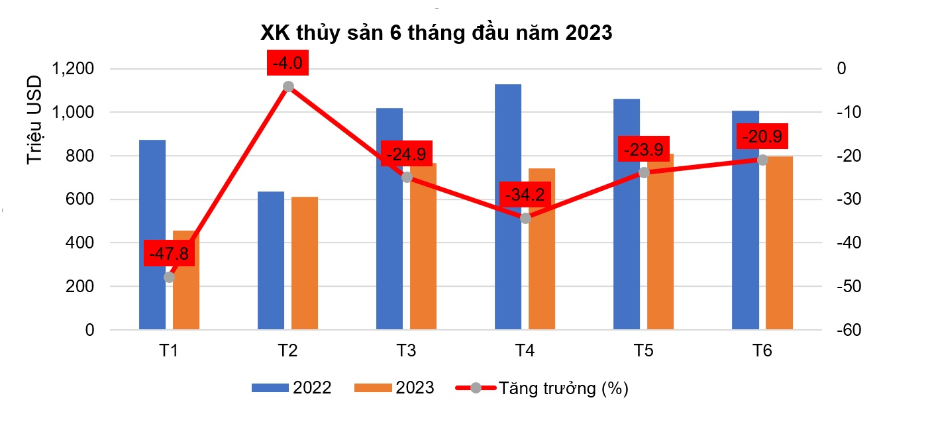 Tuy nhiên, lũy kế 6 tháng đầu năm 2023, xuất khẩu thủy sản Việt Nam vẫn thấp hơn 27% so với cùng kỳ năm ngoái, đạt gần 4,2 tỷ USD.