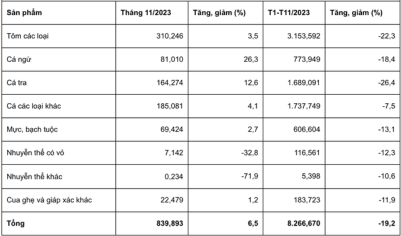 Trong tháng 11/2023, xuất khẩu thuỷ sản đạt gần 840 triệu USD, tăng 6% so với cùng kỳ, nhưng chưa thể hiện được xu hướng khả quan vì so với những tháng trước không có sự đột phá về doanh số.