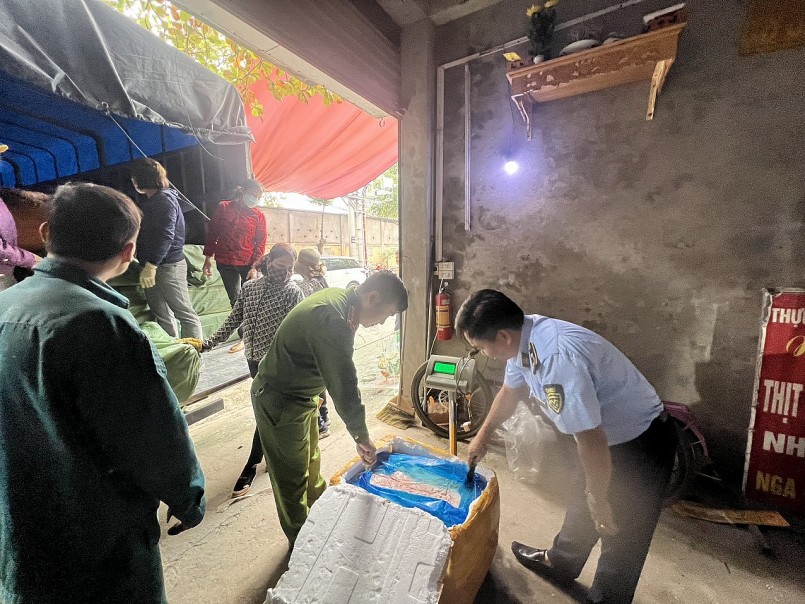 Tại thời điểm kiểm tra, đoàn kiểm tra phát hiện trên thùng xe có chứa 10 tấn nầm lợn tươi sống đông lạnh không có hóa đơn chứng từ chứng minh nguồn gốc xuất xứ. Ước tính tổng trị giá số hàng hóa trên 1 tỷ đồng.