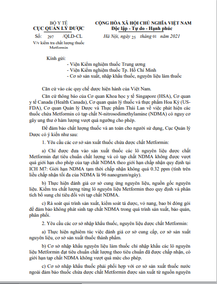 Căn cứ thông báo của Cơ quan Khoa học y tế Singapore (HSA), Cơ quan y tế Canada (Health Canada), Cơ quan quản lý thuốc và thực phẩm Hoa Kỳ (USFDA), Cơ quan Quản lý Dược và Thực phẩm Thái Lan về việc phát hiện các thuốc chứa Metformin có tạp chất N-nitrosodimethylamine (NDMA) có nguy cơ gây ung thư ở hàm lượng vượt quá ngưỡng cho phép. Để đảm bảo chất lượng thuốc và an toàn cho người sử dụng, Cục Quản lý Dược có ý kiến như sau: